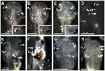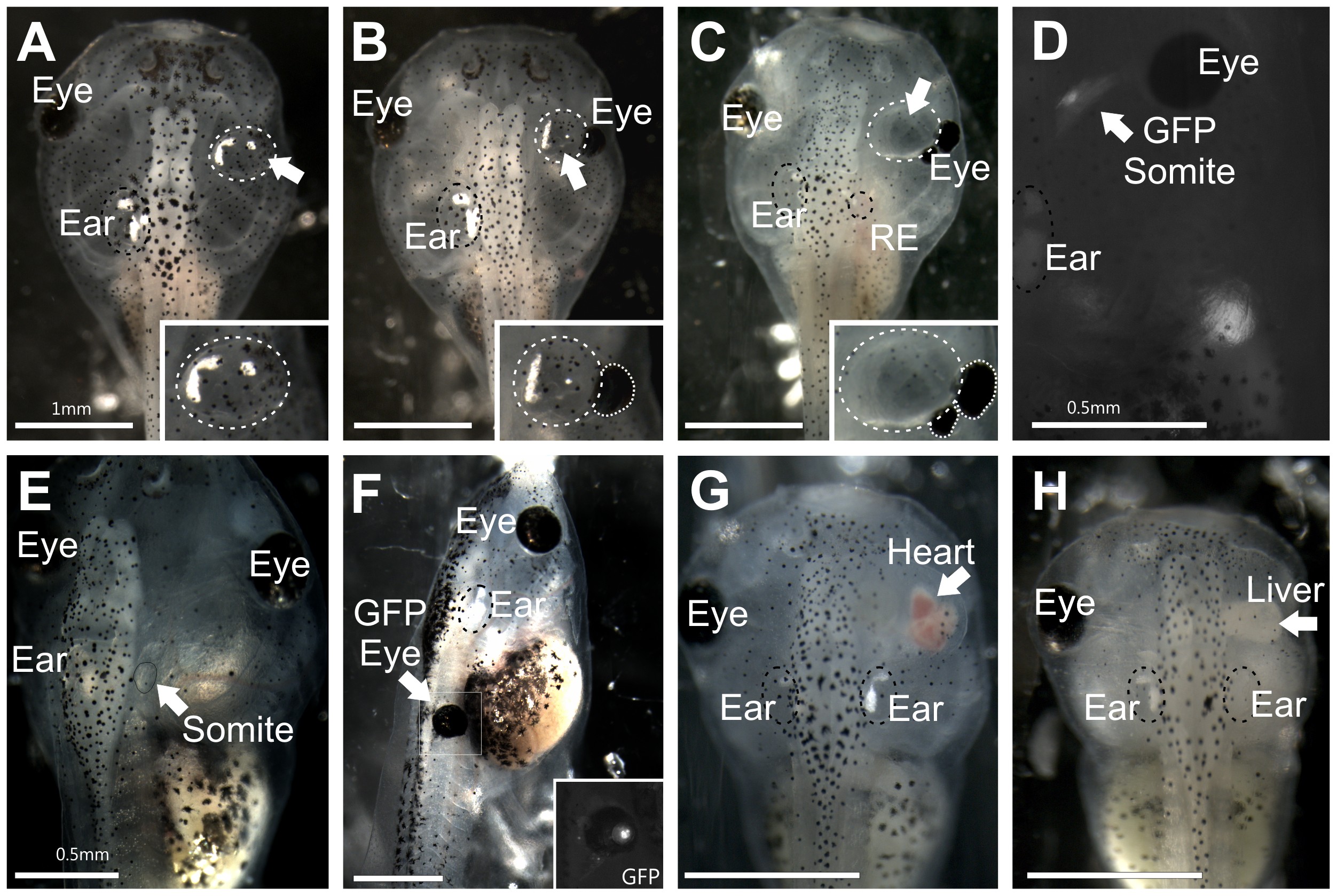 (A) Embryo with a transplanted ear containing otoconia completely replacing the eye. Inset shows higher magnification of the transplanted ear. (B) Embryo with a transplanted ear containing otoconia medial to the reformed eye. A residual ear (RE) regrew in the native location. Inset shows higher magnification of the transplanted ear and remaining portion of the eye (circled). (C) Embryo with a transplanted, empty vesicle medial to the eye, which has formed a secondary eye more caudal. A residual ear regrew in the native location. Inset shows higher magnification of the transplanted ear and remaining portion of the eye (circled). (D) Embryo with transplanted GFP-expressing somite-derived muscle tissue medial to the eye. (E) Embryo with transplanted somite-derived muscle tissue to replace the ear. (F) Embryo with a transplanted donor GFP-expressing eye to the trunk, replacing a somite. Inset shows the GFP expression in the transplanted eye and surrounding transplanted eye muscle. (G) Embryo with a transplanted heart completely replacing the eye. (H) Embryo with a transplanted liver completely replacing the eye. Native, unmanipulated ears are labeled arand are circled with a black dotted line. Eyes, native and reformed, are indicated by ye Arrows indicate transplanted tissues; transplanted ears are circled in addition with a white dotted line. Scale bar is 1 mm in A, B, C, F, H; 0.5 mm in D, E.