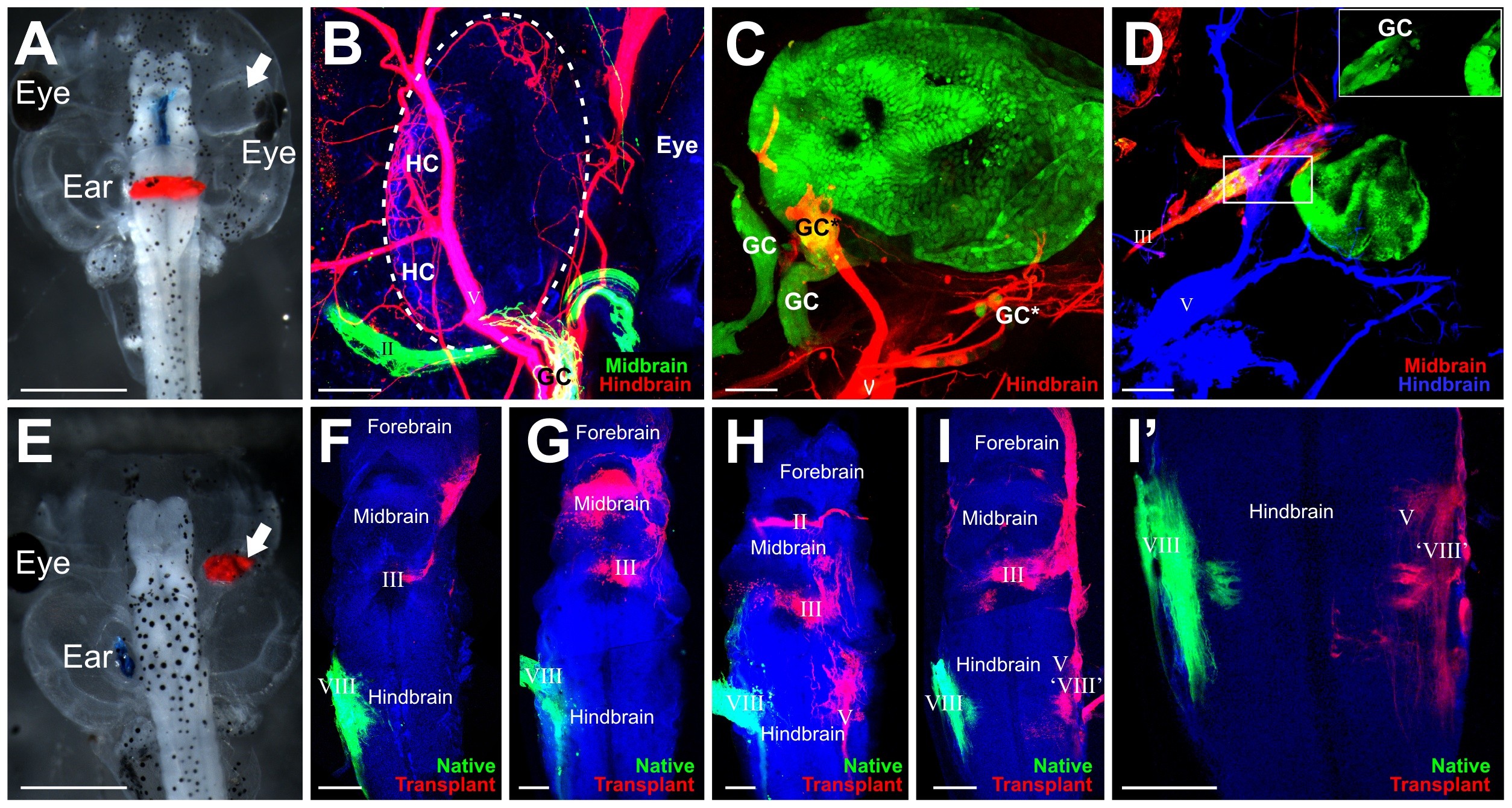 (A) Embryo showing implantation of lipophilic dyes into the midbrain (blue) and hindbrain (red). The transplanted ear is noted by the arrow. (B) Transplanted ear with ganglion cells (GC) projecting to hair cells (HC) in the inner ear and along the trigeminal nerve (V, red) back to the hindbrain. The optic nerve (II) is green. (C) Transplanted ear labeled with GFP reveals delaminated ganglion cells (GC), some of which project back to the brain (*) along the trigeminal nerve (V) as noted by colocalization with lipohilic dye. Other ganglion cells (**) did not colocalize with lipophilic dyes. (D) Transplanted ear labeled with GFP reveals delaminated ganglion cells (GC) which project back to the brain along the oculomotor nerve (III). Inset is higher magnification of boxed area showing the GFP labeled otic ganglion cells. (E) Embryo demonstrating implantations of lipophilic dyes into the native ear (blue) and transplanted ear (red, arrow). (F) Brains from embryos following lipophilic implantation into the native ear (green) and transplanted ear (red) reveal variation in afferent projections from the transplanted ear. Note: some of the lipophilic dye-labeled projections are from cranial nerves that were labeled transcellularly from the afferents. (I′) Stack of eight z-series confocal images from I showing hindbrain projections from the transplanted ear to the alar plate, probably the vestibular nucleus. Scale bar is 1 mm in A and E, 50 in B and C, 100 in D, F, G, H, I, and I′.
