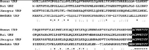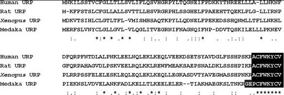 Fig. 1. Amino acid sequences of URP precursor of human, rat, Xenopus and medaka. Asterisks indicate identical amino acid residues. Mature peptides are indicated by black boxes. Amino acid sequences indicated in this figure are available in the DDBJ/EMBL/GenBank databases: human URP (AB116021), rat URP (AB116019), Xenopus URP (BAM38211), medaka URP (JQ654446).