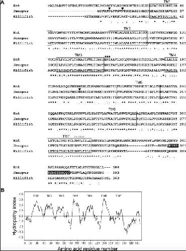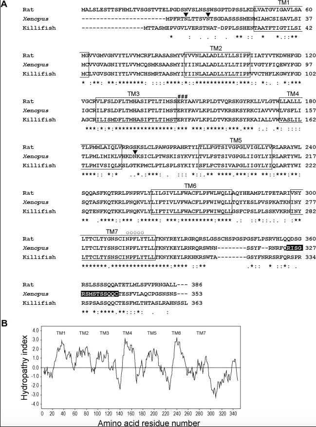 Fig. 2. The deduced amino acid sequence of UTR identified in Xenopus laevis. A The deduced amino acid sequence was aligned with those of rat UTR (GenBank accession No. U32673) and killifish UTR (GenBank accession No. HQ634242) using the ClustalW algorithm (asterisks identical amino acid residues, open box predicted transmembrane regions, black box polypeptide sequence used as the antigen to generate antibody, hash D/ERY motif, open circle NPxxY motif, black triangle N-glycosylation sites). B Kyte-Doolittle hydropathy profile of the deduced Xenopus UTR amino acid sequence predicts the presence of 7 putative transmembrane regions.