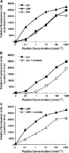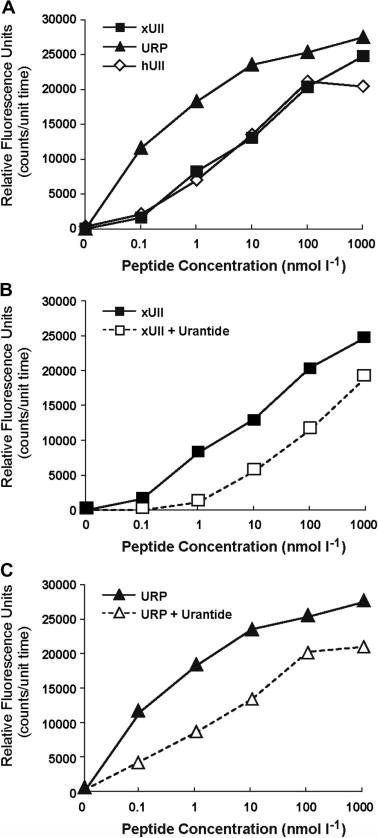 Fig. 3. Doseâresponse relationship of the UII- or URP-mediated calcium mobilization in CHO cells expressed Xenopus UTR. The CHO cells transfected with Xenopus UTR were incubated with different doses (0.1â1000 nmol lâ1) of Xenopus UII or human UII or URP. The transfected cells were loaded with Fluo-4 Ca2+-sensitive dye and were then stimulated with different doses of ligands. The fluorescent intensities for Ca2+ mobilization were determined using FLIPR (A). The cells pretreated with UTR antagonist (urantide) were stimulated with the indicated doses of ligands (B and C). The data are the means of duplicate wells.