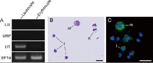 Fig. 6. Expression of Xenopus UTR in the leukocytes. A Expression of UII, URP, and UTR mRNAs in leukocytes and erythrocytes isolated from Xenopus peripheral blood. B Xenopus leukocytes smear stained with MayâGrunwaldâGiemsa. Monocyte (m), lymphocyte (l), and neutrophil (n) are easily distinguishable on the basis of these size, mono- or multi-nuclear, and cell shape. C Immunolabeling for UTR (green) was detected in the monocytes and some lymphocytes. Cell nuclei (blue) stained with DAPI. Scale bars, 20 μm. (For interpretation of the references to color in this figure legend, the reader is referred to the web version of this article.)