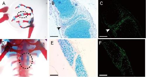 Fig. 10. Immunofluorescent localization of Xenopus UTR in the interphalangeal joint and sternum of young frog. A and D Transparent specimens of Xenopus laevis stained with alcian blue (staining for cartilage) and alizarin red (staining for bone). B A horizontal section of the interphalangeal joint stained with alcian blue. C Immunolabeling for Xenopus UTR (green) in the serial section of B was detected in the developing chondrocytes located near the interphalangeal joint. Arrowhead represents an articular surface. E A cross section of the sternum stained with alcian blue. F The chondrocytes immunostained for Xenopus UTR (green) were dispersed throughout the cartilage matrix. Scale bars, 100 μm (B, C) and 200 μm (E, F). (For interpretation of the references to color in this figure legend, the reader is referred to the web version of this article.)