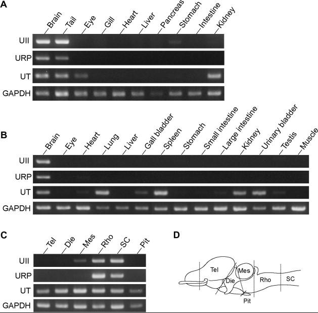 Fig. 4. Tissue distribution of Xenopus UII, URP, and UTR mRNAs by RT-PCR. Tissue expression of UII, URP, and UTR mRNAs in the premetamorphic tadpole (stage 53) (A), in adult specimen (B), and in its various brain regions (C). As shown in drawing (D), the CNS was divided to 6 parts. Abbreviations: Die, diencephalon; Mes, mesencephalon; Pit, pituitary; Rho, rhombencephalon; Sc, spinal cord; Tel, telencephalon.