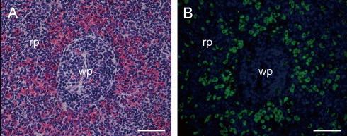 Fig. 5. Expression of Xenopus UTR in the spleen. A Section of Xenopus spleen stained with hematoxylin and eosin. Surrounding white pulp (wp) is the red pulp (rp) containing eosinophilic cells (likely macrophages). B In the adjacent section, immunolabeling for Xenopus UTR (green) overlapped with the localization of eosinophilic cells. Cell nuclei (blue) stained with DAPI. Scale bars, 100 μm. (For interpretation of the references to color in this figure legend, the reader is referred to the web version of this article.)