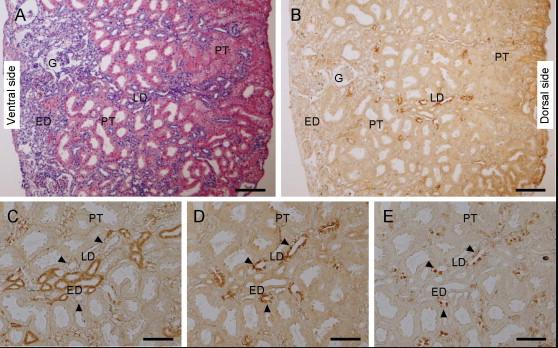 Fig. 7. Immunohistochemical localization of Xenopus UTR in the kidney. A Longitudinal section of Xenopus kidney stained with hematoxylin and eosin. B In serial section of A, immunolabeling (brown) for UTR was observed in the apical membrane and subapical cytoplasm of the late distal tubules (LD) located in the middle zone of the kidney. C-E Immunolabeling for Na+/K+-ATPase (C, brown) was observed in the basolateral membrane domains of epithelial cells in the early distal tubules (ED), but not in the late distal tubule (arrowheads) where UTR expresses (D). Immunolabeling for vacuolar type H+-ATPase (E, brown) was present in the apical membrane domains of the intercalated cells along the late distal tubules to the collecting tubule. Abbreviations: ED, early distal tubule; G, glomerulus; LD, late distal tubule; PT, proximal tubule. Scale bars, 100 μm (A, B) and 50 μm (CâE). (For interpretation of the references to color in this figure legend, the reader is referred to the web version of this article.)