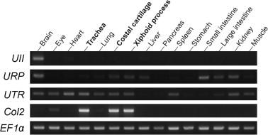 Fig. 11. Expression of rat UII, URP, and UTR mRNAs in various tissues including cartilages by RT-PCR. Rat UTR mRNA was expressed in the trachea, costal cartilage and xiphoid process, which characterized by the expression of type 2 collagen (Col2) known as a specific marker of hyaline cartilage.