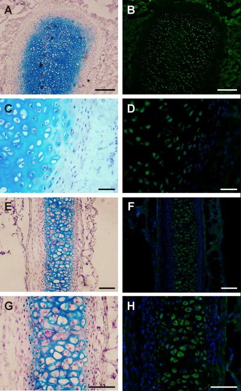 Fig. 12. Immunofluorescent localization of rat UTR in the costal cartilage and xiphoid process. AâD A sagittal section of the costal cartilage stained with alcian blue (A, C). Immunolabeling for rat UTR (green) was detected in the hyaline chondrocytes (B, D). EâH A cross section of the xiphoid process stained with alcian blue (E, G). The chondrocytes immunostained for rat UTR (green) were dispersed throughout the cartilage matrix (F, H). Scale bars, 200 μm (A, B) and 50 μm (CâH). (For interpretation of the references to color in this figure legend, the reader is referred to the web version of this article.)
