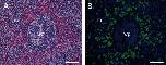 Fig. 5. Expression of Xenopus UTR in the spleen. A Section of Xenopus spleen stained with hematoxylin and eosin. Surrounding white pulp (wp) is the red pulp (rp) containing eosinophilic cells (likely macrophages). B In the adjacent section, immunolabeling for Xenopus UTR (green) overlapped with the localization of eosinophilic cells. Cell nuclei (blue) stained with DAPI. Scale bars, 100 μm. (For interpretation of the references to color in this figure legend, the reader is referred to the web version of this article.)