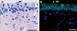Fig. 8. Immunofluorescent localization of Xenopus UTR in the urinary bladder. A Section of stretched frog urinary bladder stained with hematoxylin and eosin. Urinary bladder consists of the transitional epithelium (te), lamina propria (lp), and smooth muscle layers (sm). B Immunofluorescent labeling for the UTR (green) was observed in the apical surface of the transitional epithelium. Cell nuclei (blue) stained with DAPI. Scale bars, 25 μm. (For interpretation of the references to color in this figure legend, the reader is referred to the web version of this article.)