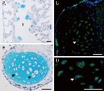 Fig. 12. Immunofluorescent localization of rat UTR in the costal cartilage and xiphoid process. AâD A sagittal section of the costal cartilage stained with alcian blue (A, C). Immunolabeling for rat UTR (green) was detected in the hyaline chondrocytes (B, D). EâH A cross section of the xiphoid process stained with alcian blue (E, G). The chondrocytes immunostained for rat UTR (green) were dispersed throughout the cartilage matrix (F, H). Scale bars, 200 μm (A, B) and 50 μm (CâH). (For interpretation of the references to color in this figure legend, the reader is referred to the web version of this article.)
