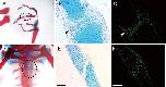 Fig. 10. Immunofluorescent localization of Xenopus UTR in the interphalangeal joint and sternum of young frog. A and D Transparent specimens of Xenopus laevis stained with alcian blue (staining for cartilage) and alizarin red (staining for bone). B A horizontal section of the interphalangeal joint stained with alcian blue. C Immunolabeling for Xenopus UTR (green) in the serial section of B was detected in the developing chondrocytes located near the interphalangeal joint. Arrowhead represents an articular surface. E A cross section of the sternum stained with alcian blue. F The chondrocytes immunostained for Xenopus UTR (green) were dispersed throughout the cartilage matrix. Scale bars, 100 μm (B, C) and 200 μm (E, F). (For interpretation of the references to color in this figure legend, the reader is referred to the web version of this article.)
