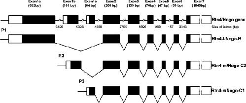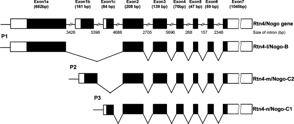 Figure 1. Three Rtn4/Nogo-related transcripts were generated by alternative promoter usage and alternative RNA splicing. Genomic organization of the zebrafish Rtn4/Nogo gene was shown. Exons are indicated by boxes numbered 1–7. Solid boxes indicate the Rtn4/Nogo coding region, whereas open boxes represent the 5′- and 3′-untranslated regions. Introns and the 5′-flanking regions are indicated by solid lines. All three isoforms have identical sequences derived from exons 2 to 7 but not exon 1. Exon 1a was used for Rtn4-l/Nogo-B, exon 1b for Rtn4-m/Nogo-C2 and exon 1c for Rtn4-n/Nogo-C1. The 5′-upstream promoter regions of each exon 1 are, respectively, designated P1, P2 and P3.