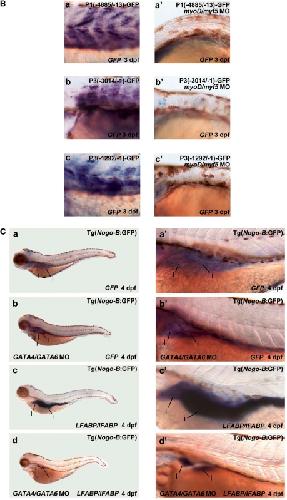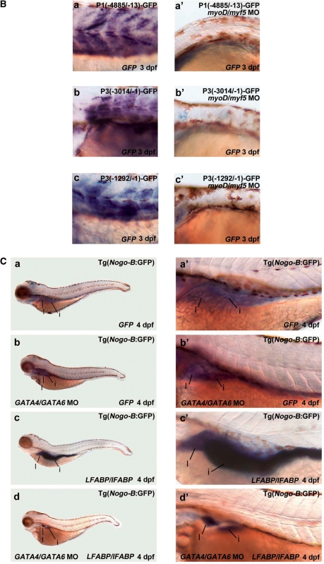 Figure 7. Loss of MyoD and Myf5 ablates somatic fast muscle and knockdown of GATA4 and GATA6 results in loss of GFP signal in the liver and intestine. (A) P1(−4885/−13)-GFP, P3(−3014/−1)-GFP and P3(−1292/−1)-GFP were separately injected or each coinjected with myod/myf5 double MOs into zebrafish embryos at the one-cell stage. Alternatively, myod/myf5 double MOs were injected to the transgenic Tg(Nogo-B:GFP) line at the one-cell stage. Zebrafish embryos at 48 hpf with GFP signals were selected for image analysis. Merged bright-field and fluorescence images are shown in panels (a’–h’), while fluorescence images are shown in panels (a–h). Scale bars indicate 100 μm. (B) Those embryos mentioned above at 3 dpf were subjected to whole-mount in situ hybridization using GFP as probe. All myod/myf5 double morphants did not show GFP signal. (C) GATA4/GATA6 double MOs were injected into zebrafish embryos of transgenic Tg(Nogo-B:GFP) line at one- to two-cell stage. The GATA4/GATA6 double-morphants and the parental transgenic line at 4 dpf were subjected to whole-mount in situ hybridization using GFP (panels a and b) and LFABP/iFABP (panels c and d) as probe. The liver and intestine were enlarged in panels (a’–d’).