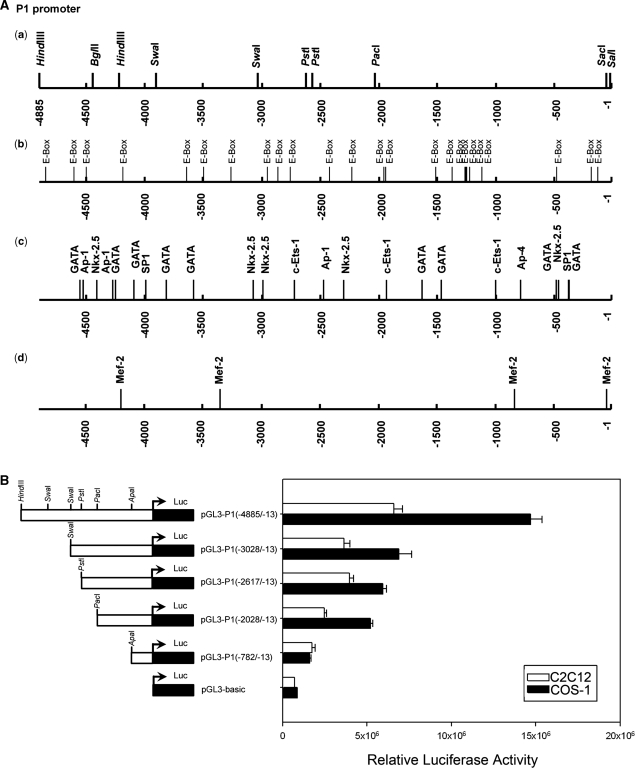 Figure 2. Activity of the 5′-upstream region of the P1 promoter in cultured cells. (A) Restriction map and possible transcription factor-binding motifs in the P1 promoter (−4885/−13). (B) COS-1 and C2C12 cells were cotransfected with 1 μg of each reporter construct and pSV-β-galactosidase, respectively. Cell lysates were prepared at 48 h after transfection and subjected to a luciferase activity assay. pGL3-Basic was used as the negative control.