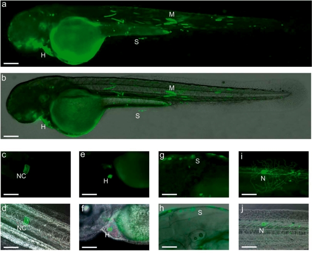 Figure 3. Activity of the 5′-upstream region of the P1 promoter in zebrafish embryos. P1(-4885/-13)-GFP was microinjected into zebrafish embryos at the one-cell stage. Zebrafish embryos at 48-h post-fertilization (hpf) with GFP signals were selected for image analysis. Embryos are shown in lateral view with the anterior to the left and dorsal to the top. H, heart; S, skin; M, muscle; N, neuron; NC, notochord. Scale bars represent 100 (panels a and b) and 20 μm (panels c–j).