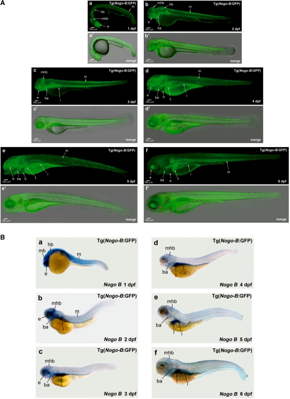 Figure 4. Expression patterns of the GFP in the transgenic zebrafish Tg(Nogo-B:GFP) line. Microinjection of the expression construct, P1(−4885/−13)-GFP, into zebrafish embryos at the one-cell stage and generation of a transgenic GFP line via Tol2-mediated transgenesis are described in the text. (A) contains images from the Tg(Nogo-B:GFP) transgenic line at different developmental stages. Merged bright field and fluorescence images are shown in panels a’–d’, while fluorescence images are shown in panels a–d. (B) Localization of Rtn4-l/Nogo-B mRNA in Tg(Nogo-B:GFP) fish at different developmental stages. ba, brachial arches; e, eyes; hb, hindbrain; i, intestine; l, liver; m, muscle; mhb, midbrain–hindbrain boundary.