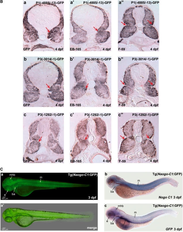 Figure 6. Activity of the 5â²-upstream regions of the P2 and P3 promoters in zebrafish embryos. (A) P2(â3230/â1)-GFP, P2(â1213/â1)-GFP, P3(â3014/â1)-GFP and P3(â1292/â1)-GFP were separately microinjected into zebrafish embryos at the one-cell stage. Zebrafish embryos at 48-hpf with GFP signals were selected for image analysis. For comparison, embryos injected with the α-actin promoter (panel e) displayed strong GFP expression specifically in muscles. Merged bright-field and fluorescence images are shown in panels aââeâ, while fluorescence images are shown in panels aâe. Scale bars indicate 100 μm. (B) Zebrafish embryos at 4 dpf mentioned above were subjected to cryosection and labelled with different antibodies as follow. The primary antibodies were mAb F59 (anti-MyHC, slow muscle) at 1: 20, mAb EB165 (anti-MyLC, fast muscle) at 1 : 200 and rabbit anti-GFP at 1: 200 dilution. After washing, slides were incubated with peroxidase-tagged secondary antirabbit antibodies at 1 : 200 dilution and stained with Fast DAB. (C) Expression patterns of GFP and Rtn4-n/Nogo-C1 in the transgenic zebrafish Tg(Nogo-C1:GFP) line. Images were taken from the Tg(Nogo-C1:GFP) transgenic line at 3 dpf. Merged bright-field and fluorescence images are shown in panel (a), while fluorescence images are shown in panel (aâ). Expression of Rtn4-n/Nogo-C1 (panel b) and GFP (panel c) mRNA in the transgenic zebrafish Tg(Nogo-C1:GFP) line was analysed by whole-mount in situ hybridization. ba, brachial arches; e, eyes; i, intestine; m, muscle; mhb, midbrain-hindbrain boundary.