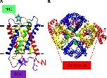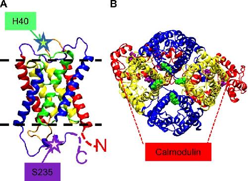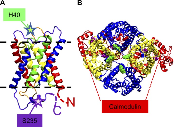 Figure 1. Topology and structure of AQP0. (A) Each AQP0 monomer is composed of six transmembrane domains (1–6) and five loops (A–E) in rainbow color (ROYGIBV). The pore is formed by two half helices and loops B and E (in green) folded back into the membrane. Major players in the cooperativity are H40 in the external loop A and S235 in the C terminus tail. (B) The tetramer is shown from the extracelluar side with the four monomers (blue and mustard) and the two CaMs (red). Both panels were generated with VMD from a molecular dynamics simulation based on crystal structures (deposited in the Protein Data Bank under accession no. 1TM8 for AQP0; Harries et al., 2004; and Protein Data Bank accession no. 1NWD for CaM; Yap et al., 2003) originally modeled together in Reichow and Gonen (2008).
