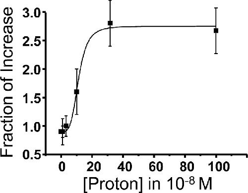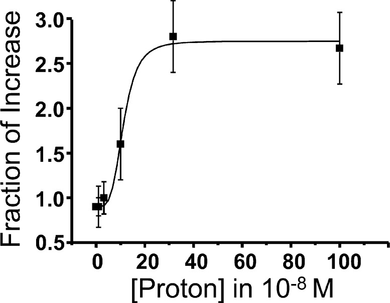 Figure 2. pH dose–response curve of the water permeability of AQP0. The solid black line is a fit to the Hill equation, with n = 4 (χ2/DOF = 0.0068 and R2 = 0.994).