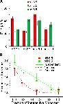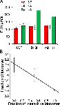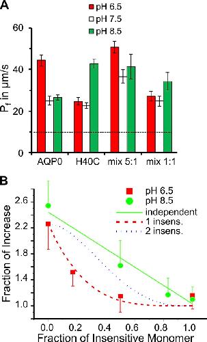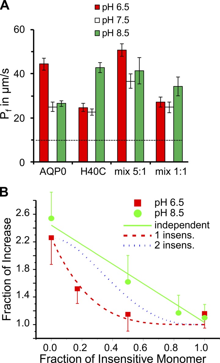 Figure 3. pH cooperativity. (A) Effect of acid and alkaline pH on the water permeability of mixtures of AQP0 (WT) and the H40C mutant. WT responds to acid pH, whereas the H40C mutant responds to alkaline pH. Mix 5:1 represents 10 ng AQP0 and 2 ng of mutant H40C (fraction of insensitive monomer = 2/12 = 0.166), and mix 1:1 represents 10 ng AQP0 and 10 ng of mutant H40C (fraction of insensitive monomer = 10/20 = 0.5). The Pf of the mix 1:1 at pH 8.5 is greater than the Pf at pH 7.5, with a p-value of 5 × 10−5 (Student’s t test). The horizontal dotted line represents the water permeability of uninjected oocytes. (B) Fraction of increase plotted against the fraction of insensitive monomer. (For acid pH, the H40C mutant is the insensitive monomer. For alkaline pH, WT is the insensitive monomer.) Experimental results for acid pH are plotted as red squares and are well fit by a curve calculated from the binomial distribution of monomers randomly partitioning into each tetramer and the assumption that a single insensitive monomer renders the whole tetramer insensitive to acid pH (dashed red line; χ2 = 0.840). The curve assuming that two insensitive monomers are required to render the tetramer insensitive to acid pH (dashed black line; χ2 = 8.88) does not fit the experimental data. Experimental results for alkaline pH are plotted as green circles and are well fit by a straight line (the theoretical prediction assuming each monomer acts independently of the others in the tetramer; χ2/DOF = 0.071 and R2 = 0.910; solid green line). Each data point is the average of experiments using nine oocytes from three different batches.
