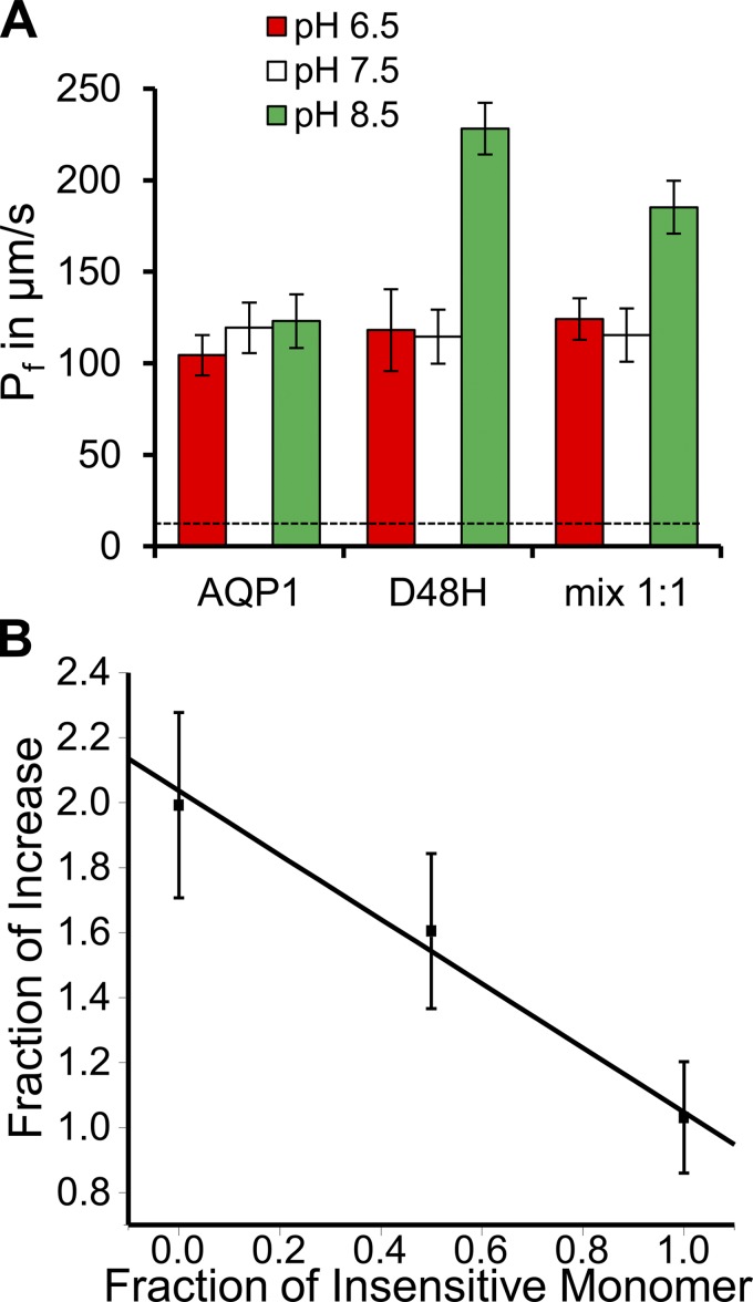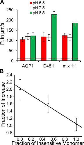 Figure 4. Alkaline pH increase of the Pf of AQP1 D48H is not cooperative. (A) Effect of acid and alkaline pH on the water permeability of AQP1 (WT) and a mutant D48H. WT does not respond to either acid or alkaline pH, whereas the D48H mutant responds to alkaline pH. Mix 1:1 represents 5 ng AQP1 and 5 ng of mutant D48H (fraction of insensitive monomer = 5/10 = 0.5). The horizontal dotted line represents the water permeability of uninjected oocytes. (B) Fraction of increase plotted against the fraction of insensitive monomer. For alkaline pH, WT is the insensitive monomer. The fraction of increase in Pf induced by alkaline pH is proportional to the fraction of insensitive monomer, indicating a lack of cooperativity between insensitive (WT) and sensitive (D48H) monomers. The data are well fit by a straight black line (R2 = 0.99) indicating that each monomer in a tetramer acts independently of the others.