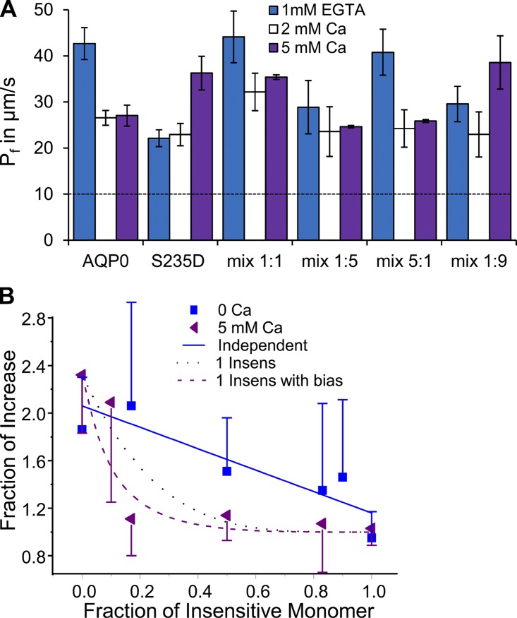 Figure 5. Calcium cooperativity. (A) Effect of calcium concentration on the water permeability of mixed injection of AQP0 (WT) and a mutant S235D. Mix 1:1 represents 10 ng AQP0 and 10 ng of mutant H40C (fraction of insensitive monomer = 10/20 = 0.5), mix 1:5 represents 2 ng AQP0 and 10 ng of mutant H40C (fraction of insensitive monomer = 2/12 = 0.17), mix 5:1 = 10 ng AQP0 and 2 ng of mutant H40C (fraction of insensitive monomer = 2/12 = 0.17), and mix 1:9 represents 1 ng AQP0 and 9 ng S235D. The left-hand panel shows the response of WT AQP0. Note that Pf increases when the calcium concentration is decreased. In contrast, an increased calcium concentration increases Pf in the S235D mutant. When the two are mixed so as to form hetero tetramers, even 20% of WT is sufficient to suppress completely the Pf increase induced by 5 mM calcium, whereas the proportional increase in Pf induced by lowering calcium remains. When the mixture contains 80% WT, the low calcium response is still present in proportion to the amount of WT, but the elevated calcium response is completely suppressed. The horizontal dotted line represents the water permeability of uninjected oocytes. (B) Fraction of increase plotted against the fraction of insensitive monomer. (For no Ca2+ response, S235D is the insensitive monomer. For 5-mM Ca2+ response, WT is the insensitive monomer.) Experimental results for 5-mM Ca2+ increase are plotted as purple triangles and are well fit by a curve calculated from the binomial distribution assuming one insensitive monomer is sufficient to render the whole tetramer insensitive and with a bias of 0.5 kT for WT to associate with mutants in a tetramer (Ding et al., 2005) (dashed purple curve; χ2 = 1.260). The dotted black curve is calculated assuming no bias and that one insensitive monomer is sufficient to render the entire tetramer insensitive to Ca2+ increase (χ2 = 3.133). Experimental data for zero calcium are plotted as blue squares and are well fit by a straight line (the theoretical prediction assuming each monomer acts independently of the others in the tetramer; χ2/DOF = 0.18774 and R2 = 0.557; blue straight line). Positive and negative errors are equal, but error bars are shown in only one direction to avoid clutter.