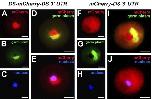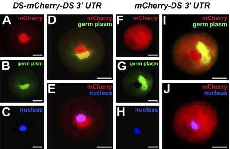 Fig. 1. DEADSouth-mCherry fusion protein is localized to the germ plasm in PGCs. mRNA of DEADSouth-mCherry-DS 39UTR (A) or mCherry-DS 39UTR (F) was injected at the vegetal pole of fertilized eggs by crossing wild-type male and mito-EGFP transgenic female Xenopus. PGCs were isolated from embryos at stage 12, fixed and stained with Hoechst 33342. Signals for mCherry, germ plasm (mitochondria) and nuclei are red, green and blue, respectively. Scale bars: 10 mm.