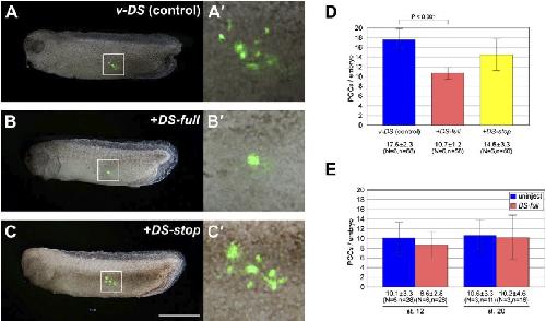 Fig. 2. DEADSouth gene overexpression decreases the number of PGCs. (A) Representative examples of stage 32 embryos injected with mRNA for v-DS only, v-DS plus DEADSouth-DS 39UTR (DS-full) and v-DS plus nonsense DEADSouth-DS 39UTR (DS-stop), respectively. Anterior is toward the left. Scale bar: 1 mm. (A99) High magnification of the areas indicated in (A), respectively. (D) The number of PGCs per embryo at stage 32 injected with the indicated mRNAs. PGC numbers were determined by externally counting from both sides. (E) The number of PGCs per embryo at the indicated stage without/with DS-full mRNA. Embryos were dissociated, and EGFP-positive and large cells were counted as PGCs. and indicate the number of experiments and total embryos examined, respectively. The P-value was calculated by the Student t-test. Error bars indicate s.d. (F) Apoptotic PGCs in DEADSouth-overexpressing embryos at stage 28. PGCs were observed after dissociating the embryonic region (red box) immunostained for Xdazl and caspase-3. Arrowheads and arrows indicate Xdazl-positive/caspase-3- negative cells (non-apoptotic PGCs) and Xdazl positive/caspase-3-positive cells (apoptotic PGCs), respectively. Scale bar: 100 mm.