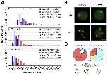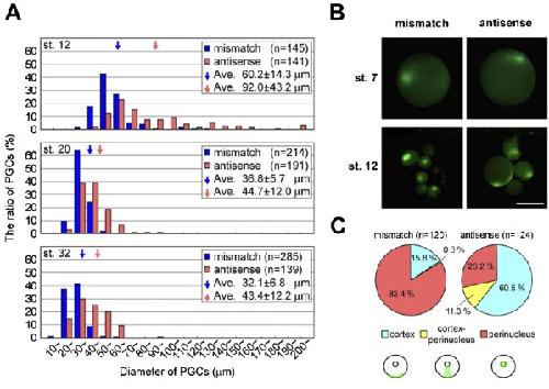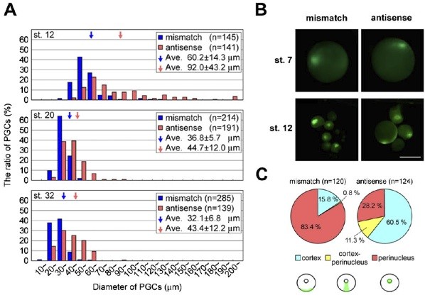 Fig. 5. Knockdown of the DEADSouth gene affects PGC division and translocation to germ plasm. (A) Size distribution of PGCs at stages 12, 20 and 32 from embryos injected with mismatch or antisense LNA gapmers. All mito-EGFP- (at stages 12 and 20) and v-DS-labeled (at stage 32) PGCs from the injected embryos were isolated to measure their diameter. Total PGC numbers after each injection are shown as 100%. indicates total PGC numbers. Arrows indicate average diameters from the indicated experiments.