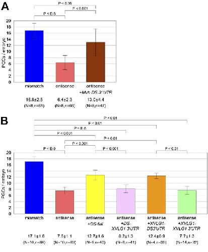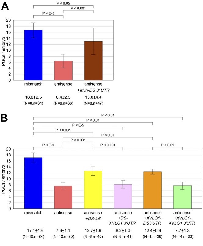 Fig. 6. Knockdown of the DEADSouth gene is rescued by another type of DEAD-box RNA helicase. (A) Rescue by injection of Mvh-DS 39UTR mRNA. (B) Rescue by injection of XVLG1 and its dependency on the 39UTR. At stage 32, PGCs were externally counted on both sides of embryos injected with the indicated mRNAs and v-DS mRNA as a PGC tracer, in addition to mismatch or antisense LNA gapmers. and indicate the number of experiments and total embryos examined, respectively. P- values and s.d. are indicated.