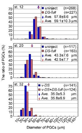 Fig. S1. Overexpression of the DEADSouth gene does not affect PGC size. The size distribution of PGCs at stages 12, 20 and 32 from embryos injected with DS-full. All mito-EGFP- (at stages 12 and 20) and v-DS-labeled PGCs (at stage 32) from injected or uninjected (control) embryos were isolated to measure their diameter. Total numbers of PGCs after each injection are shown as 100%. indicates total numbers of PGCs. Arrows indicate average diameters from the indicated experiments (DS-full/control; 59.1610.3/ 57.868.6 at stage 12, 42.567.7/43.367.6 at stage 20, 35.866.9/35.065.3 at stage 32).