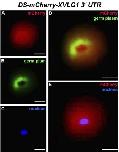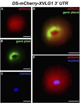 Fig. S3. The 39UTR of XVLG1 mRNA does not localize the protein to the germ plasm. Subcellular localization of DEADSouth-mCherry fusion protein in the PGCs of stage 12 embryos injected with DEADSouth-mCherry-XVLG1 39UTR (A). PGCs were isolated from mito-EGFP embryos injected with the mRNA, fixed, stained with Hoechst 33342 and examined for the location of the mCherry signal (in red), germ plasm (mitochondria, in green) and nucleus (in blue). Note that the mCherry signal is distributed throughout PGCs. Scale bars: 10 mm.