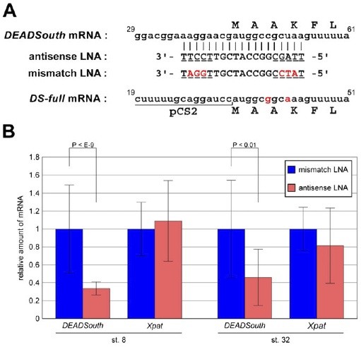 Fig. 3. An LNA gapmer causes degradation of targeted DEADSouth mRNA. (A) Sequence alignment of DEADSouth mRNA (nucleotide position 291, accession no. AF190623), antisense and mismatch LNA gapmers and synthesized DEADSouth mRNA (DS-full). Upper letters indicate the amino acid sequence. LNA modifications and mismatch bases are underlined and in red, respectively. The sequence of DS-full mRNA was predicted from that of the template DNA. (B) Quantification of DEADSouth and Xpat mRNAs in stage 8 and 32 embryos injected with LNA gapmers. The amounts of these mRNAs were determined by real-time RT-PCR, normalized to EF1a mRNA levels as an internal control, and shown as relative amounts to the mRNA level in embryos injected with mismatch LNA gapmer. P-values and s.d. are indicated.