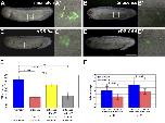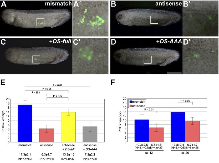 Fig. 4. The number of PGCs is decreased by knockdown of the DEADSouth gene. (A) Representative examples of stage 32 embryos injected with the mismatch LNA gapmer, antisense LNA gapmer, antisense LNA gapmer plus DS-full and antisense LNA gapmer plus mutant DEADSouth-DS 39UTR (DS-AAA), in addition to v-DS as a PGC-tracer, respectively. Scale bar: 1 mm. (A99) High magnification of the areas indicated in (A), respectively. (E) The number of PGCs per embryo at stage 32 injected with the indicated LNA gapmer(s) and mRNAs. PGC numbers were determined by externally counting from both sides. (F) The number of PGCs per embryo at the indicated stages with mismatch or antisense LNA gapmers. The injected mito-EGFP embryos were dissociated, and EGFP-positive and large cells were counted as PGCs. N and n indicate the number of experiments and total embryos examined, respectively. P-values were calculated by the one- tailed t test. Error bars indicate s.d.