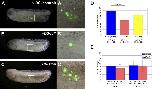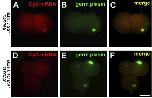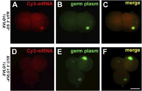 Fig. 7. DEADSouth 39UTR localizes the mRNA to the germ plasm. Localization of Cy3-labeled XVLG1D-DS 39UTR mRNA (A) and Cy3- labeled XVLG1D-XVLG1 39UTR mRNA (D) in PGCs at stage 7. PGCs were isolated from mito-EGFP embryos injected with these mRNAs and observed for Cy3 signals (mRNA, in red) and germ plasm (mitochondria, in green). Note that the Cy3 signal is superimposed on the germ plasm in (A). Scale bar: 10 mm.