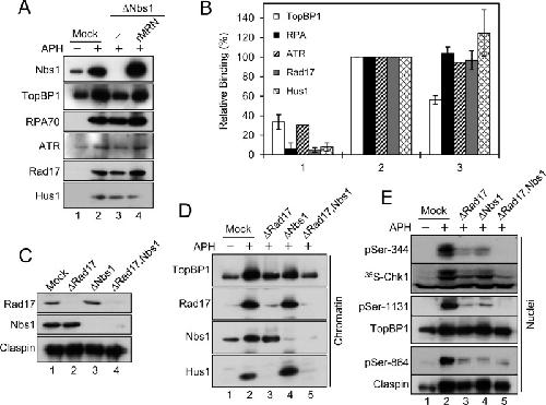 FIGURE 3:. MRN and Rad17 regulate activation of Chk1 in an additive manner. (A) Mock-treated (lanes 1 and 2) or Nbs1-depleted (lanes 3 and 4) extracts were incubated in the absence (lane 1) or presence (lanes 2–4) of APH. Recombinant MRN was added back to the incubation shown in lane 4. Chromatin fractions were prepared and immunoblotted for the indicated proteins. (B) Quantitation of binding of proteins to chromatin in mock-treated extracts incubated in the absence (1) or presence (2) of APH and in Nbs1-depleted extracts incubated in the presence of APH (3). Values, compiled from two independent experiments, are expressed relative to mock-treated, APH-containing extracts. (C) Egg extracts were subjected to an immunodepletion procedure with control antibodies (lane 1), anti-Rad17 antibodies (lane 2), anti-Nbs1 antibodies (lane 3), or both anti-Rad17 and anti-Nbs1 antibodies (lane 4). Extracts were immunoblotted for the indicated proteins. (D) Extracts from (C) were incubated in the absence (lane 1) or presence (lanes 2–5) of APH. Chromatin fractions were immunoblotted for the indicated proteins. (E) Extracts from (C) were incubated with [35S]Chk1 in the absence (lane 1) or presence (lanes 2–5) of APH. Nuclear fractions from the extracts were processed for phosphorimaging to detect [35S]Chk1 (second panel from top) or for immunoblotting with antibodies that detect pSer-344 of Chk1, pSer-864 of Claspin, Claspin, pSer-1131 of TopBP1, and TopBP1, as indicated in the remaining panels. |