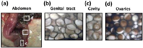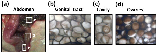 Figure 1. Ovulated eggs are retained in the frog body at different locations. The frog was dissected in 48 hours after hormonal stimulation (a) and the indicated fields of the abdomen (b, c, d) were observed microscopically.