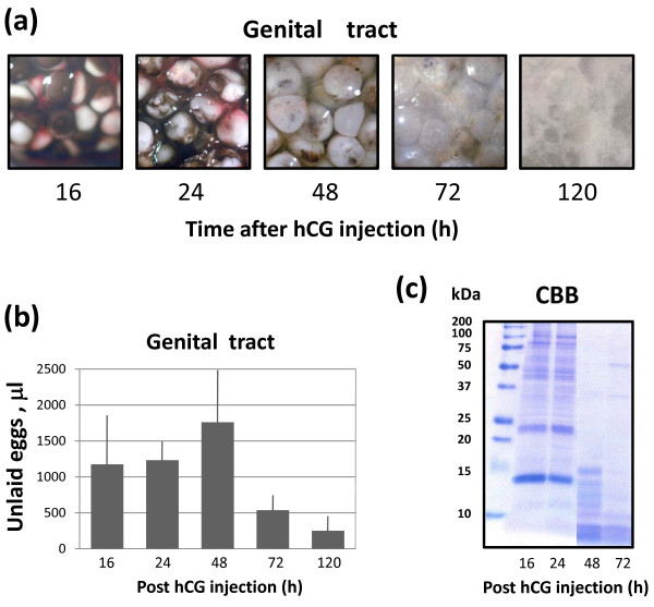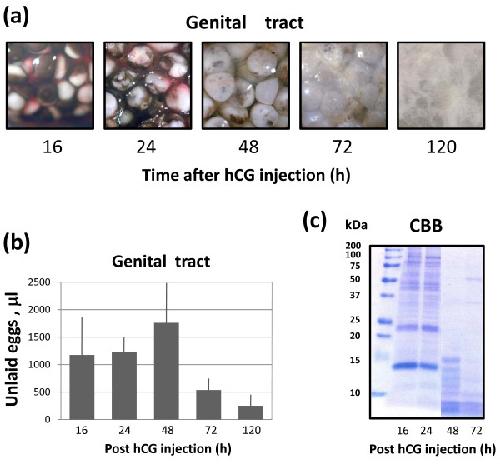 Figure 2. Dynamics of egg degradation in the genital tract. Changes in the morphology of eggs retained in the frog genital tract over five days are shown in (a), the total volume of unlaid eggs in the uterus is presented in (b) and CBB staining of total egg proteins separated by SDS PAGE is shown in (c).