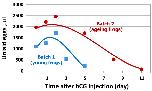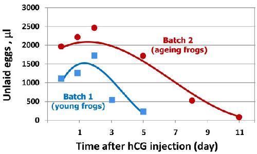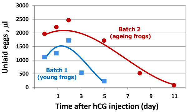 Figure 5. Dynamics of egg retention in young and ageing frogs. The total volume of unlaid eggs retained in the uteri of young (Batch 1) and ageing (Batch 2) frogs at different time after hCG administration is presented. The graphs were smoothed using Excel chart smoothing algorithm.