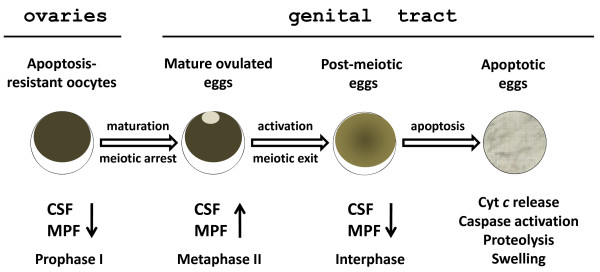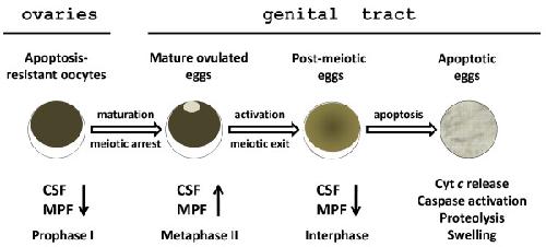 Figure 6. Degradation of the unlaid Xenopus eggs. In the ovaries, fully grown apoptosis-resistant oocytes are naturally arrested in prophase I with the low activity of CSF and MPF. After hormone-induced ovulation, a number of matured eggs now arrested at the metaphase II by the high activity of CSF and MPF are retained in the frog genital tract. They experience spontaneous meiotic exit and initiate a classical cytochrome c-mediated apoptotic program, accompanied by global proteolysis of intracellular proteins. Finally, the eggs completely deteriorate and lose their integrity inside the frog body.