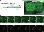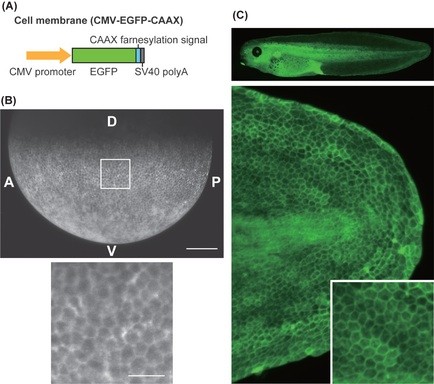 Fig. 1. Generation of transgenic frogs expressing enhanced green fluorescent protein (EGFP) in the plasma cell mem- brane. (A) The transgene for cell mem- brane labeling, EGFP-CAAX, consists of a cytomegalovirus (CMV) promoter, EGFP, and the c-Ha-Ras farnesylation signal. (B) Lateral view of a stage 13 transgenic embryo (Tg: EGFP-Mem) observed with digital scanned light- sheet microscopy (DSLM). The boxed region in the upper panel is magnified in the lower panel. Scale bars: upper panel, 200 lm; lower panel, 50 lm. A, anterior; P, posterior; D, dorsal; V, ven- tral. (C) Lateral view of a stage 41 transgenic tadpole (Tg: EGFP-Mem/ H2B-red fluorescent protein [RFP]). Lower panels: progressively magnified views of the tail region shown in the upper panel. Data in (B) are from a pre- vious study (Morita et al. 2012).