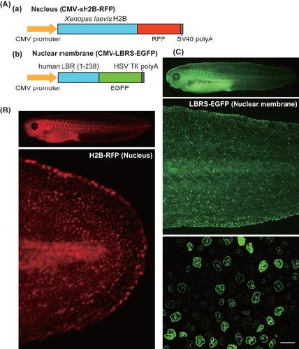 Fig. 2. Generation of transgenic frogs for live imaging and morphological anal- ysis of the nuclei. (A) Structure of the constructed transgenes. (a) Nucleus- targeted transgene, cytomegalovirus (CMV)-xH2B-red fluorescent protein (RFP), consisting of a CMV promoter, Xenopus laevis Histone 2B (xH2B), and RFP. (b) Nuclear membrane-targeted transgene, CMV-Lamin B receptor (LBRS)-EGFP, consisting of a CMV promoter, 1�238 amino acids (a. a.) of human lamin B receptor (LBRS), and EGFP. (B) Lateral view of a stage 41 transgenic tadpole (Tg: EGFP-Mem/ H2B-RFP). The lower panel shows a magnified view of the tail region shown in the upper panel. (C) Lateral view of a stage 40 transgenic tadpole (Tg: LBRS- EGFP). Middle panel: magnified view of the tail region in upper panel. Lower panel: nuclei of a transgenic neurula- stage embryo expressing EGFP in the nuclear membrane. Scale bar, 20 lm.