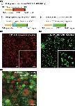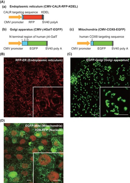 Fig. 3. Generation of transgenic frogs expressing fluorescent proteins that specifically label organelles. (A) Struc- ture of the constructed transgenes. (a) The endoplasmic reticulum (ER)-label- ing transgene cytomegalovirus (CMV)- Calreticulin (CALR)-red fluorescent pro- tein (RFP)-KDEL consists of a CMV promoter, the calreticulin (CALR) target- ing sequence, RFP, and the KDEL cod- ing sequence. (b) The Golgi apparatus- labeling transgene CMV-b4GalT-EGFP consists of a CMV promoter, the N ter- minal 81 a. a. of human b1,4-galacto- syltransferase (b4GalT), and EGFP. (c) The mitochondria-labeling transgene CMV-COX8-EGFP consists of a CMV promoter, the mitochondrial targeting sequence from subunit VIII of human cytochrome c oxidase (COX8), and EGFP. (B) ER expressing RFP, in the epithelium of a stage 28 transgenic embryo (Tg: RFP-ER). (C) Golgi expressing EGFP, in the epithelium of a stage 28 transgenic embryo (Tg: EGFP- Golgi). (D) Mitochondria expressing EGFP (green) and nuclei expressing RFP (red), in the epithelium of a stage 28 transgenic embryo (Tg: EGFP-Mito/ H2B-RFP). Scale bars (B�D), 10 lm