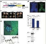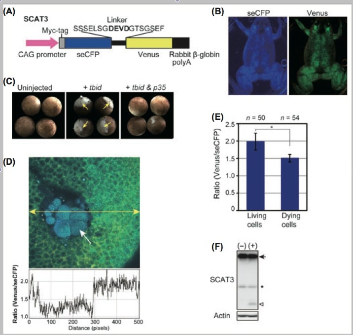 Fig. 6. Generation of transgenic frogs expressing a fluorescence resonance energy transfer (FRET)-based biosensor SCAT3 and cas- pase activation in dying cells. (A) Structure of CAG-SCAT3 transgene containing the fluorescence indicator molecule SCAT3 and the rab- bit b-globin polyA signal sequence, under control of the CAG promoter. SCAT3 is a hybrid protein of seCFP-Venus linked with the caspase-3 recognition sequence (DEVD). (B) Whole-body fluorescence of a SCAT3-expressing frog (Tg: SCAT3): seCFP (left) and of Venus (right) fluorescence in a juvenile transgenic frog. Data were shown in a previous study (Kominami et al. 2006). (C) The morphology of embryos undergoing cell death by tBid expression. Uninjected embryos (left) and tbid mRNA-injected (middle) or both tbid and p35 mRNAs-injected (right) embryos at the four-cell stage were developed to stage 9 and photographed. p35 mRNA was used to inhibit caspase-3 activation and prevent apoptosis. The arrows indicate the area where cell death occurs. (D) Monitoring of the fluorescence intensity and assessment of the FRET ratio of SCAT3 in transgenic embryos. Upper panel. The fluorescent image of the SCAT3 trans- genic embryo injected with tbid mRNA. A white arrow indicates a group of dying cells in an embryo, which developed to stage 10. Lower panel. The graphic pattern of the emission ratio based on the fluorescence intensity of SCAT3 on the line shown in an upper panel. The FRET ratio of SCAT3 was decreased in dying cells. (E) The statistical analysis on the FRET ratio in the embryos subjected to tbid mRNA microinjection. The graph represents the mean ` SD. �n� indicates the total number of cells examined in four embryos. The significant difference between the two groups were evaluated by Student�s t-test. An asterisk shows P < 0.001. (F) Immunoblot analysis. Transgenic embryos were injected without (�) or with tbid mRNA (+) at the 2-cell stage and their cell extracts were prepared at stage 10. Exogenous SCAT3 and endogenous actin were detected by sodium dodecyl sulfate�polyacrylamide gel electrophoresis (SDS� PAGE), followed by immunoblotting with anti-myc and anti-actin antibodies, respectively. The arrow and arrowhead indicate the full- length and the cleaved form of SCAT3. An asterisk indicates an immune reactant molecule.