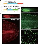 Fig. 4. Analyses of microtubule dynamics in vivo using an EB3-enhanced green fluorescent protein (EGFP) fusion protein. (A) A trans- gene constructed for microtubule labeling, cytomegalovirus (CMV)-hEB3-EGFP, consists of a CMV promoter, 1�281 a. a. of human EB3, and EGFP. (B) Microtubules expressing EB3-EGFP, in the epithelium of a stage 28 transgenic embryo (Tg: EB3-EGFP). Scale bar, 20 lm. (C) Serial live images of EGFP-tagged EB3. EB3 bound to microtubule ends was monitored every 4 s. An arrow indicates an EB3 comet moving toward the cell rim. (D) A spindle during cell division of a stage 19 transgenic embryo, observed every 4 s. Scale bars (C, D), 10 lm.