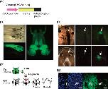 Fig. 5. Generation of transgenic frogs expressing Venus, and transplant engraftment of their brain tissue. (A) Structure of CAG-Venus transgene, composed of the fluorescent reporter gene Venus and the rabbit b-globin polyA signal sequence under control of the CAG promoter. (B) Fluorescent analyses of transgenic animals: Images of a transgenic tadpole at stage 50 (upper animal in left panels) and a juvenile frog (right panel) carrying the CAG-Venus transgene (Tg: Venus) captured by fluorescence microscopy. (C) A diagram of the protocol for brain transplantation. The anterior one-third of the forebrain of wild-type (WT) tadpoles at stages 55-58 was surgically removed, and a fragment of the whole brain from a CAG-Venus transgenic (Tg) tadpole (stages 56-58) was implanted. Following the transplanta- tion, the recipient larvae were kept in water for one or 3 weeks. (D) Morphological analysis: heads of recipient tadpole and frog (left). Fluorescent images at 1 week (upper panels) and 3 weeks (lower panels) are shown. Panels at right are higher magnifications of middle panels. Arrows indicate engrafted areas. (E) Histological analysis of the grafted brain. A frozen brain section dissected from a recipient frog 3 weeks post-surgery was counter-stained with Hoechst33342 dye, and fluorescent images in the same field were used to detect nuclei (left panel) and Venus (right panel) under the microscope. Abbreviations: areas derived from a transgenic (Tg) donor or wild-type (WT) recipient. Scale bars, 50 lm. Data from a previous study (Sakamaki et al. 2005) are cited and shown in a modified form (B-E).