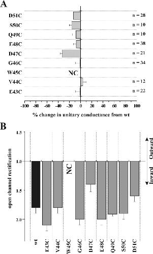 Figure 2. . Individual Cys substitutions from E43 through D51, with the exception of W45C, form functional hemichannels. Plotted are changes in unitary conductance (A) and magnitudes of single open-hemichannel current rectification (B). The change in unitary conductance represents the mean percentage change in the slope conductance compared with wt Cx46 measured at Vm = 0 from fitted open channel I-V relations. Open hemichannel current rectification was measured as the ratio of the currents at −70 mV and at +70 mV (see materials and methods). NC denotes nonfunctional hemichannels. Error bars represent standard deviations. For each mutant, n represents the number of separate patches examined containing single hemichannels.
