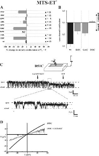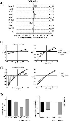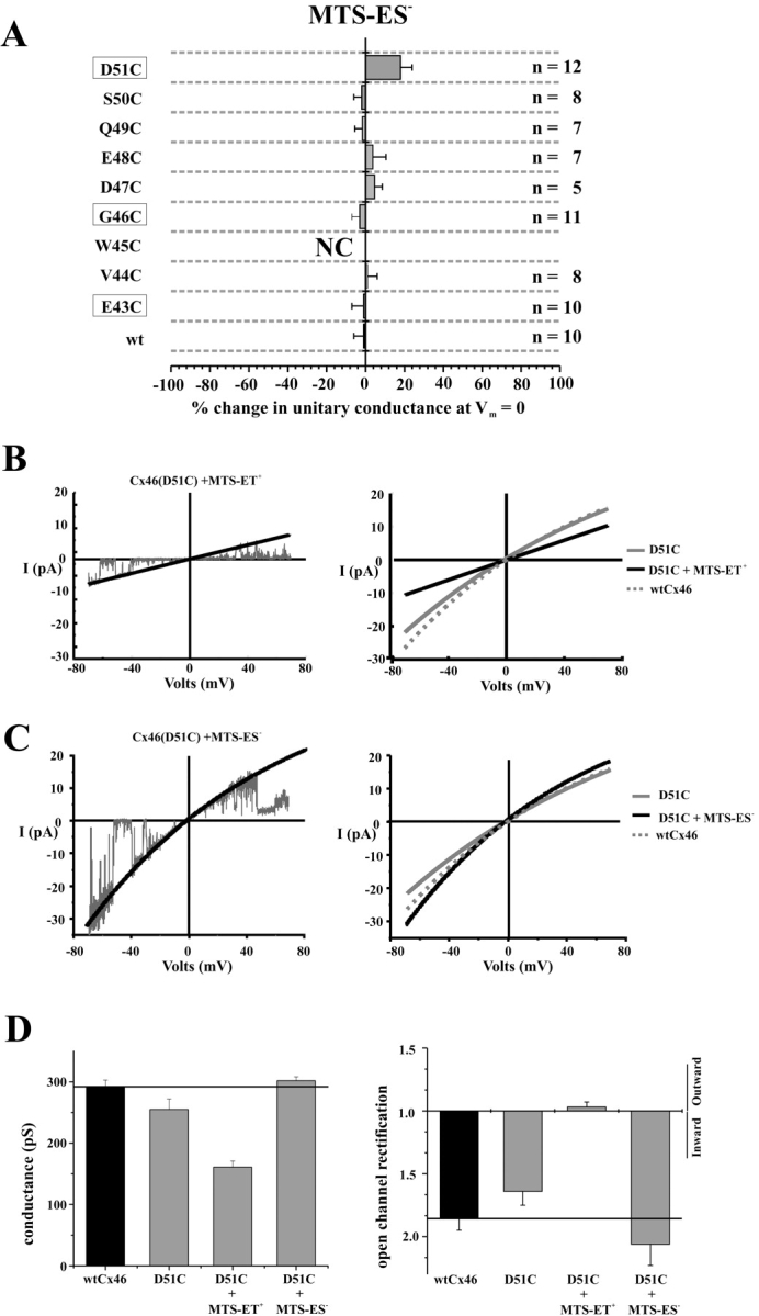 Figure 4. . SCAM using MTS-ES− shows an increase in conductance and rectification at D51C. (A) Plot of the percentage change in unitary conductance for each residue after application of 5.0 mM MTS-ES−. For each residue, unitary conductance represents the mean percentage change in the slope conductance relative to the corresponding Cys substituted mutant measured at Vm = 0 from fitted open channel I-V relations. As for MTS-ET+, data from inside-out and outside-out patches showed no differences and were pooled together with cell-attached recordings of prereacted oocytes. Only D51C hemichannels showed a measurable change with MTS-ES− and that was an increase rather than a decrease in conductance. Boxed residues are those found to be modified by MTS-ET+. wtCx46 hemichannel currents showed no measurable change with 5 mM MTS-ES−. Error bars represent standard deviations. For each mutant, n represents the number of separate patches examined containing single hemichannels. NC denotes nonfunctional hemichannels. (B and C) Examples of single hemichannel I-V relations of D51C hemichannels before and after reaction with (B) MTS-ET+ and (C) MTS-ES−. Left panels show reacted single D51C hemichannels; black lines are fits to the open hemichannel currents from single voltage ramps. Right panels show superimposed fits of the data to D51C hemichannel currents before (solid black lines) and after (solid gray lines) reaction with MTS-ET+ or MTS-ES−. Fits to wt Cx46 (dashed lines) open hemichannel currents are included for comparison. For each MTS reagent, the fitted open hemichannel currents shown before and after addition of reagent are from the same hemichannel. (D) Summary of data comparing unitary conductance (left panel) and open channel rectification of wt Cx46, unreacted D51C, and D51C reacted with MTS-ET+ and MTS-ES−. The solid horizontals lines denote mean values for conductance and rectification of wt Cx46 hemichannels. Error bars represent standard deviations. For each mutant, n represents the number of separate patches examined containing single hemichannels.