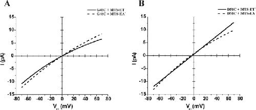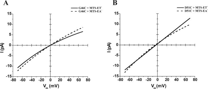 Figure 5. . Effects of modification with MTS-EA+ differ modestly from that with MTS-ET+. Examples of I-V relations of single open G46C (A) and D51C (B) hemichannel currents after application and washout of MTS-EA+ (dashed lines) or MTS-ET+ (solid lines). The lines represent fits to the data for single voltage ramps. Mean values are illustrated in Fig. 6 B.